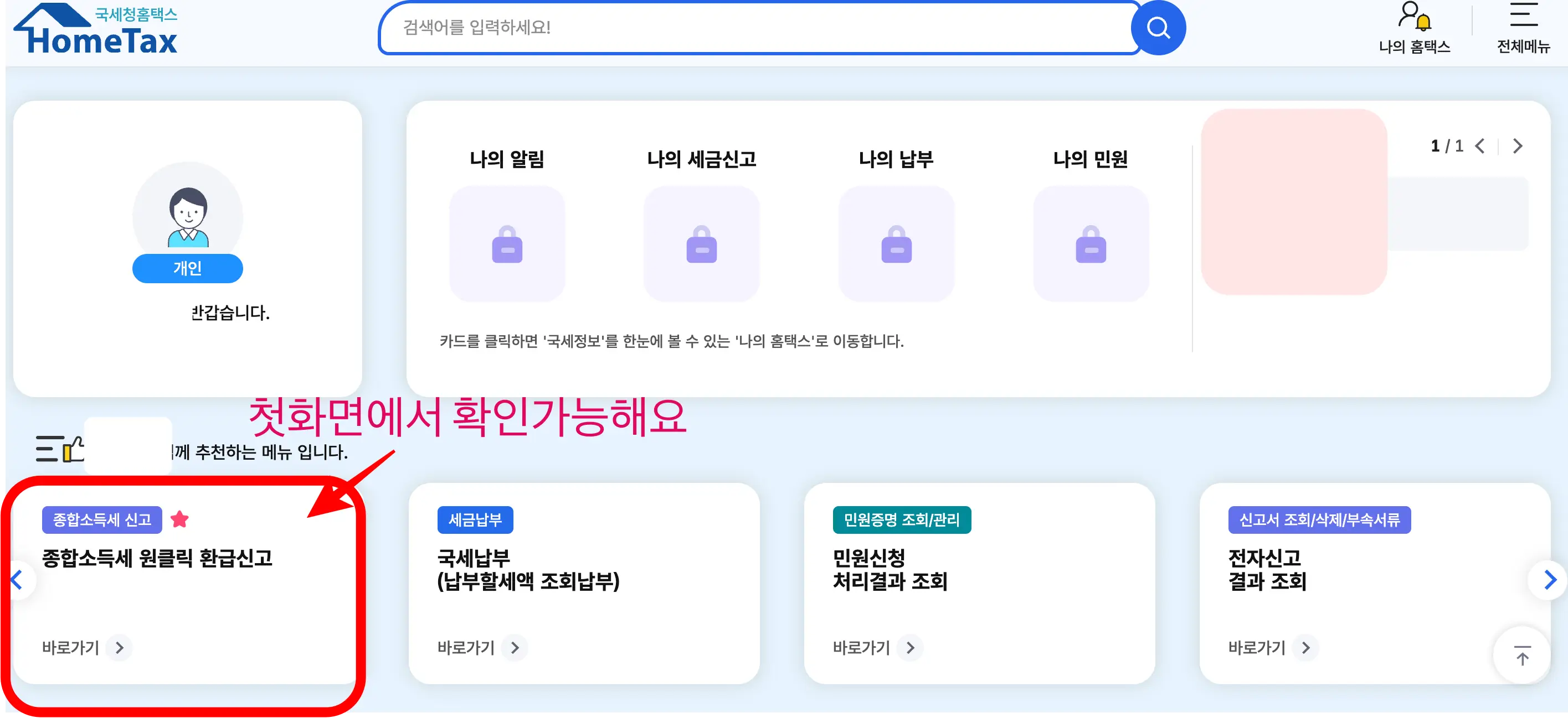 간편인증을 통해 본인인증 절차를 마치고 로그인하면 첫화면에서 '종합소득세 원클릭 환급신청' 배너를 확인할 수 있습니다. 이 버튼을 통해 들어간 페이지에서 환급 가능한 세금 액수를 즉시 확인할 수 있습니다. 확인 후 '신청하기' 버튼만 클릭하면 환급 신청이 완료됩니다.