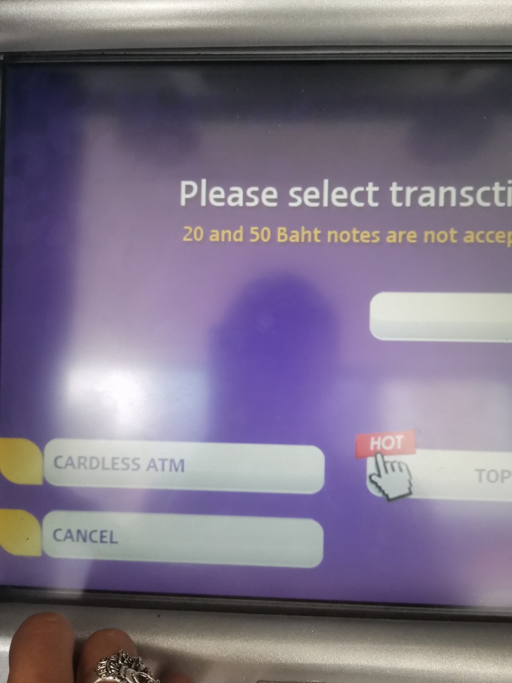 제 경우, 처음 시도한 ATM에서는 cashmallow 옵션이 보이지 않아 옆 ATM으로 이동해 다시 시도했습니다. 옆 ATM에서는 영어 언어 선택 후 cardless ATM 메뉴가 나타났고, 순조롭게 QR코드 스캔을 완료하여 5000바트를 성공적으로 인출했습니다.