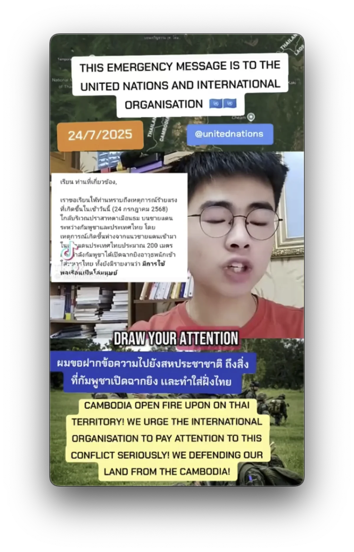 영상에 담긴 자막은 “국제사회는 지금 당장 주목해야 한다”, “우리는 캄보디아의 침략에 저항하고 있다”는 주장을 일관되게 펼치고 있습니다. 자막의 표현 방식과 메시지 구성으로 볼 때, 태국 측 혹은 친정부 세력에서 제작한 것으로 추정되며, 이 충돌을 국제사회에 알리고 지지를 유도하기 위한 목적이 뚜렷하게 느껴집니다.