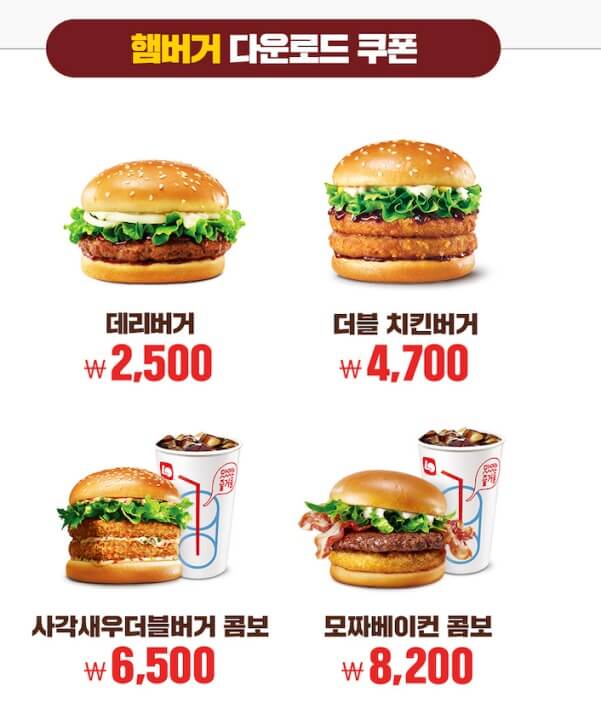 햄버거 쿠폰은 위의 4가지입니다. 2개는 단품, 2개는 콤보입니다.