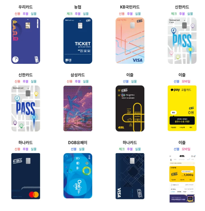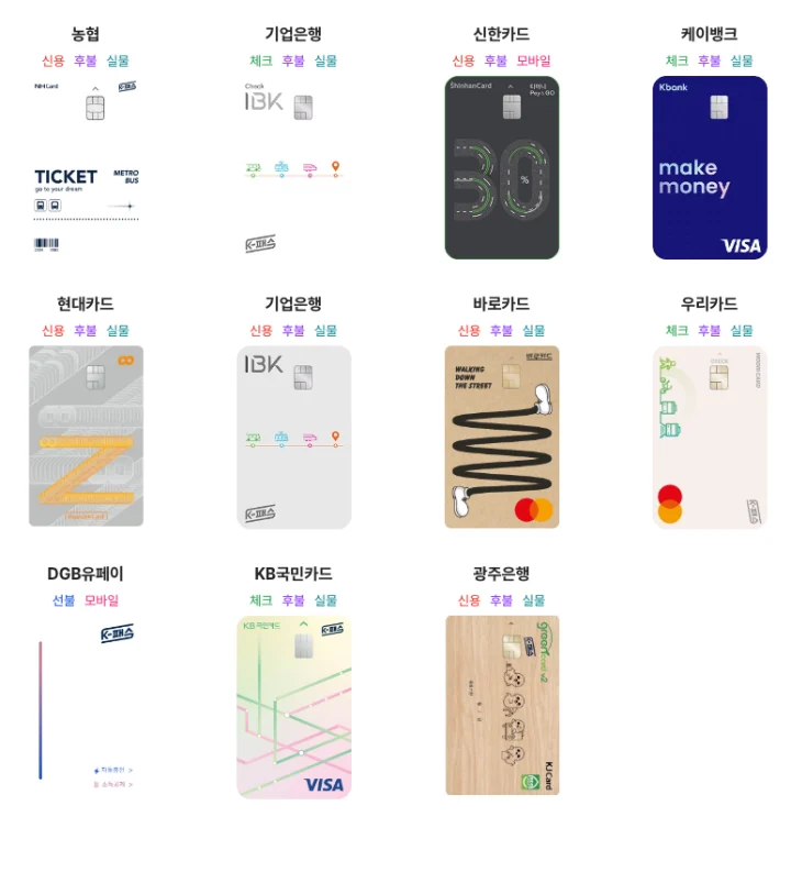 정말 다양한 기능의 카드들이 있는데요. 후불제와 선불제 중 하나를 선택하면 선택할 수 있는 범위가 조금 줄어듭니다. 한달 후에 결제가 되는 신용카드 기능을 넣을 것인가 결재할 때마다 바로 은행 통장에서 빠져나가는 첵크카드 기능의 교통카드를 선택할 수도 있습니다.